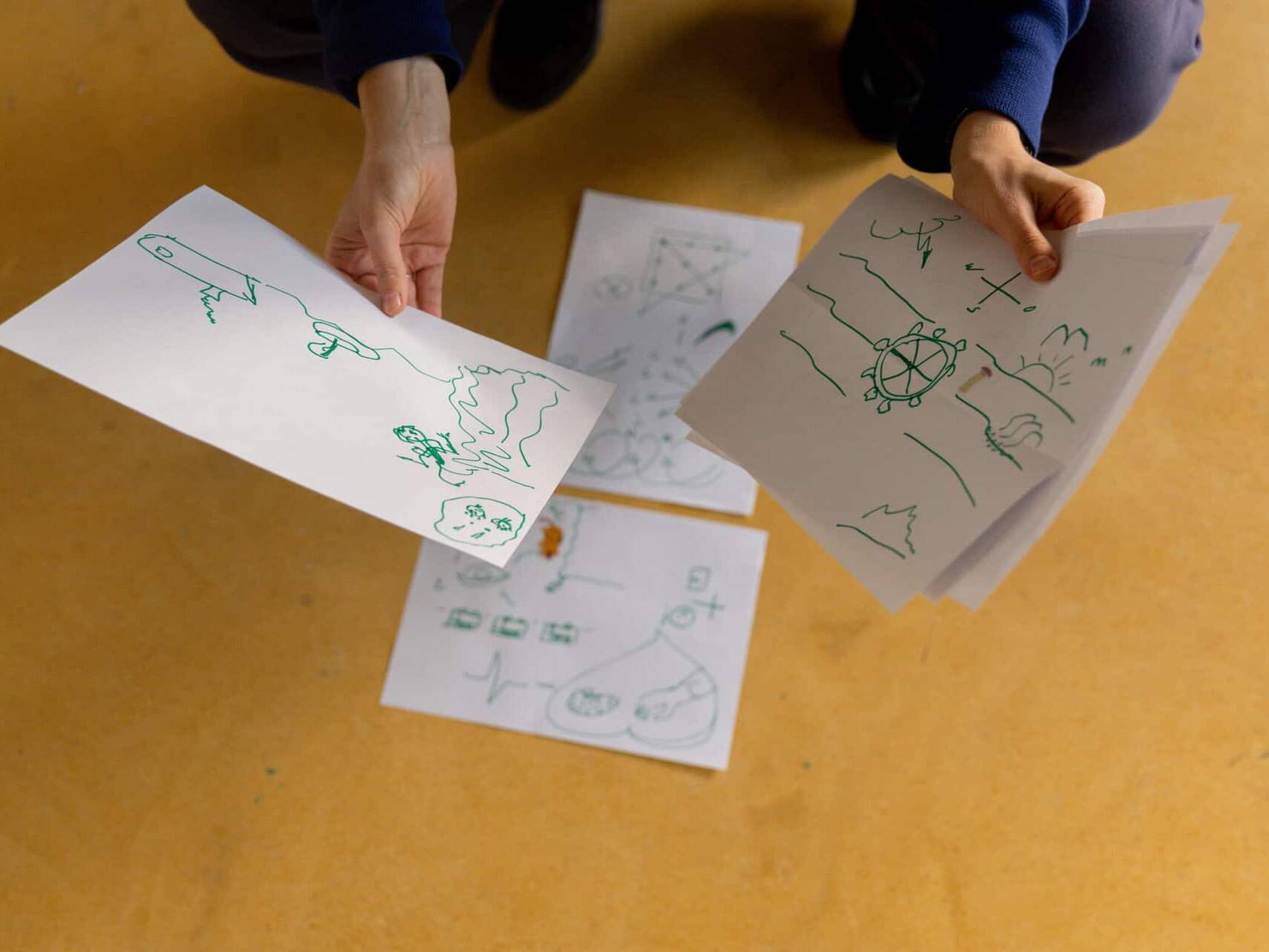 Dazu durchwanderten wir verschiedene Räumlichkeiten des Design Film Kunst Campus Emmenbrücke. Durch die ständige Bewegung und Wechsel der Kontexte entstanden neue Gespräche und Eindrücke. Die Aktivitäten kombinierten Selbstreflexion, Peer-Learning und Mapping – unterstützt durch ein eigens gestaltetes Workshop-Set aus Inspirationszitaten, samenförmigen Reflexionskarten, Stickern und Reiseproviant.
